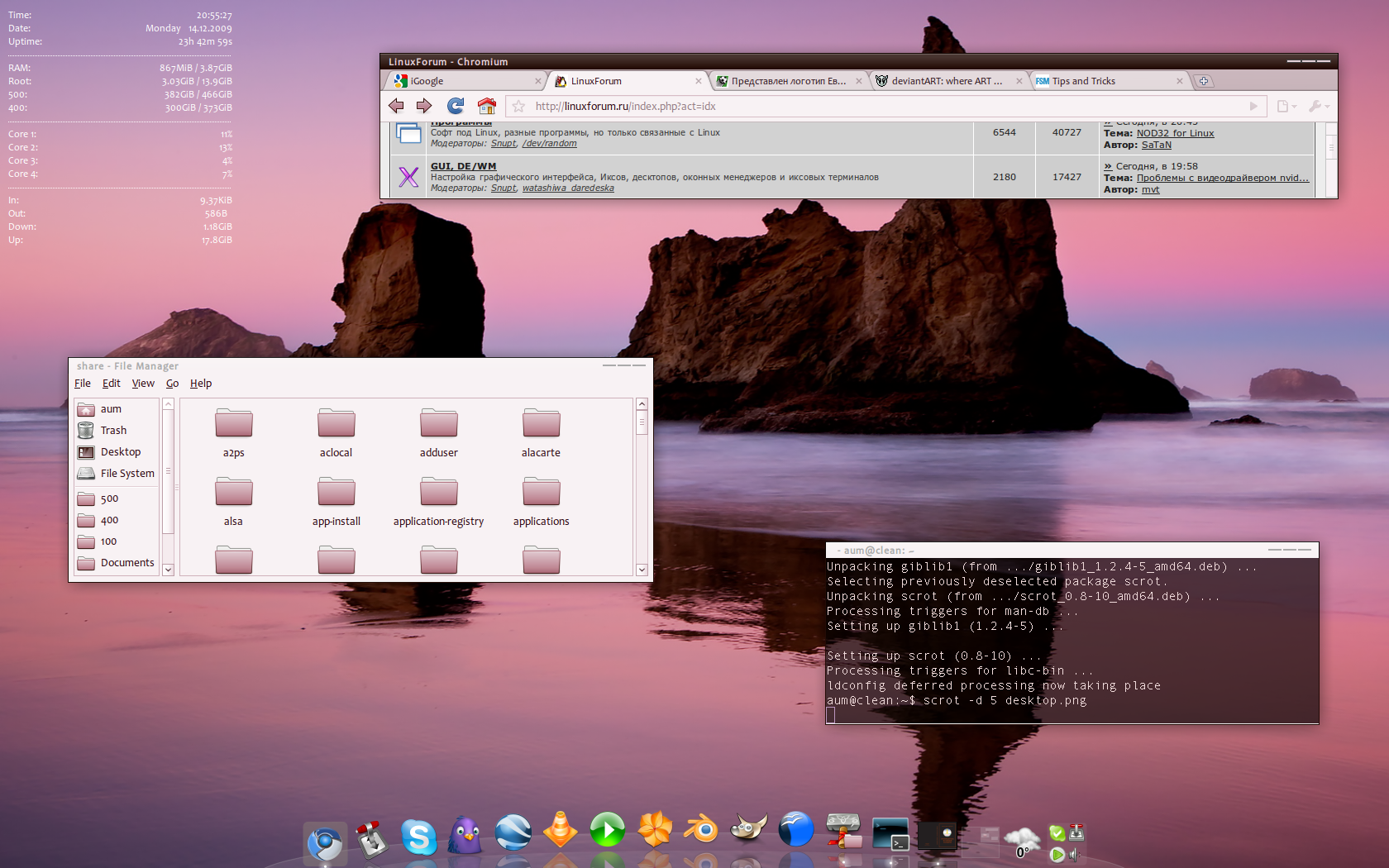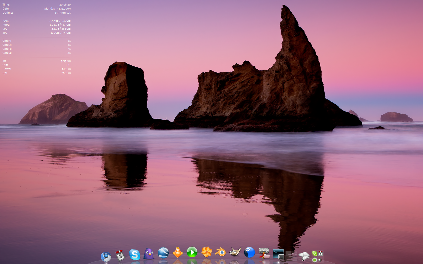 2. Conky не видно. Хоть бы на волпапере серенький полупрозрачный прямоугольник под него нарисовали. И зачем вам там версия ядра, имя пользователя, время, swap usage (которого нет), speed mode (который тоже ничего не показывает) и core clock? top и uptime так уж и быть, а то там совсем ничего не останется %). А вот цвета к обоям вполне подходят. Если бы ещё не сливались...