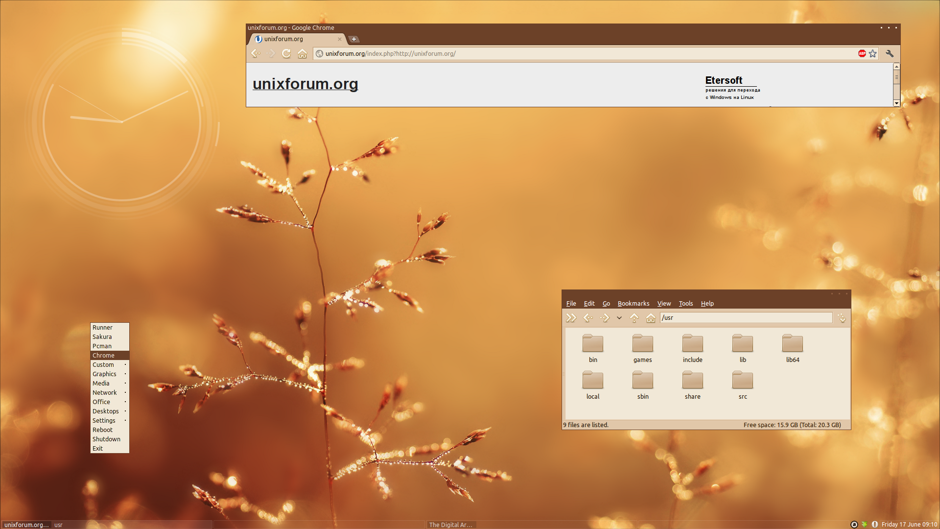 Свой скрин уже публиковал, но с тех пор произошли некоторые изменения. Отказался от индикатора раскладки в пользую индикации через Scroll Lock, переместил кнопку сворачивания окна в title направо. И в прошлом скрине я не открывал меню "Пуск". Индикатор раскладки я пользовал sbxkb, он оказался довольно глючным. По крайней мере с IceWM.