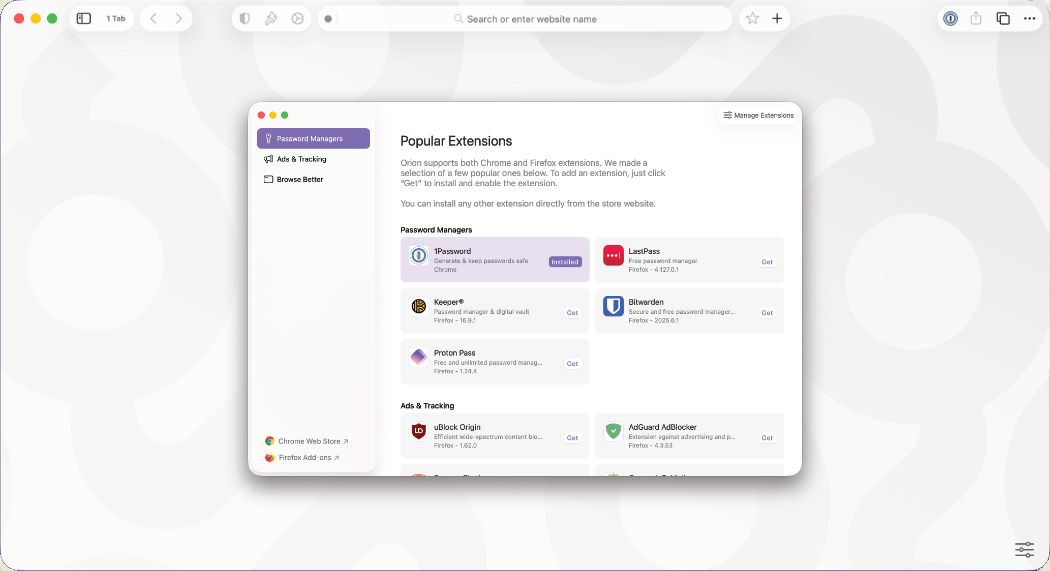 Orion предлагает дополнительные возможности кастомизации интерфейса и просматриваемых страниц, не ограничивающиеся сменой тем оформления. Например, можно добавлять в панель собственные кнопки для вызова JavaScript-кода или выполнения доступных в браузере функций. Возможно изменение шрифтов, отключение непрокручиваемых заголовков, принудительное применение тёмного оформления для сайтов, а также выборочное отключение JavaScript, Cookie и внешних шрифтов.